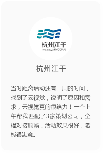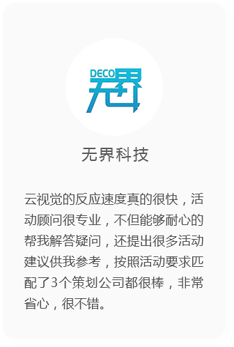 云視覺匯集海量傳媒公司和傳媒行業(yè)大咖,采用自主研發(fā)的CRM管理系統(tǒng),通過大數(shù)據(jù)方式篩選優(yōu)秀的活動服務(wù)商,是您找傳媒公司、找傳媒藝人的高效可靠途徑。